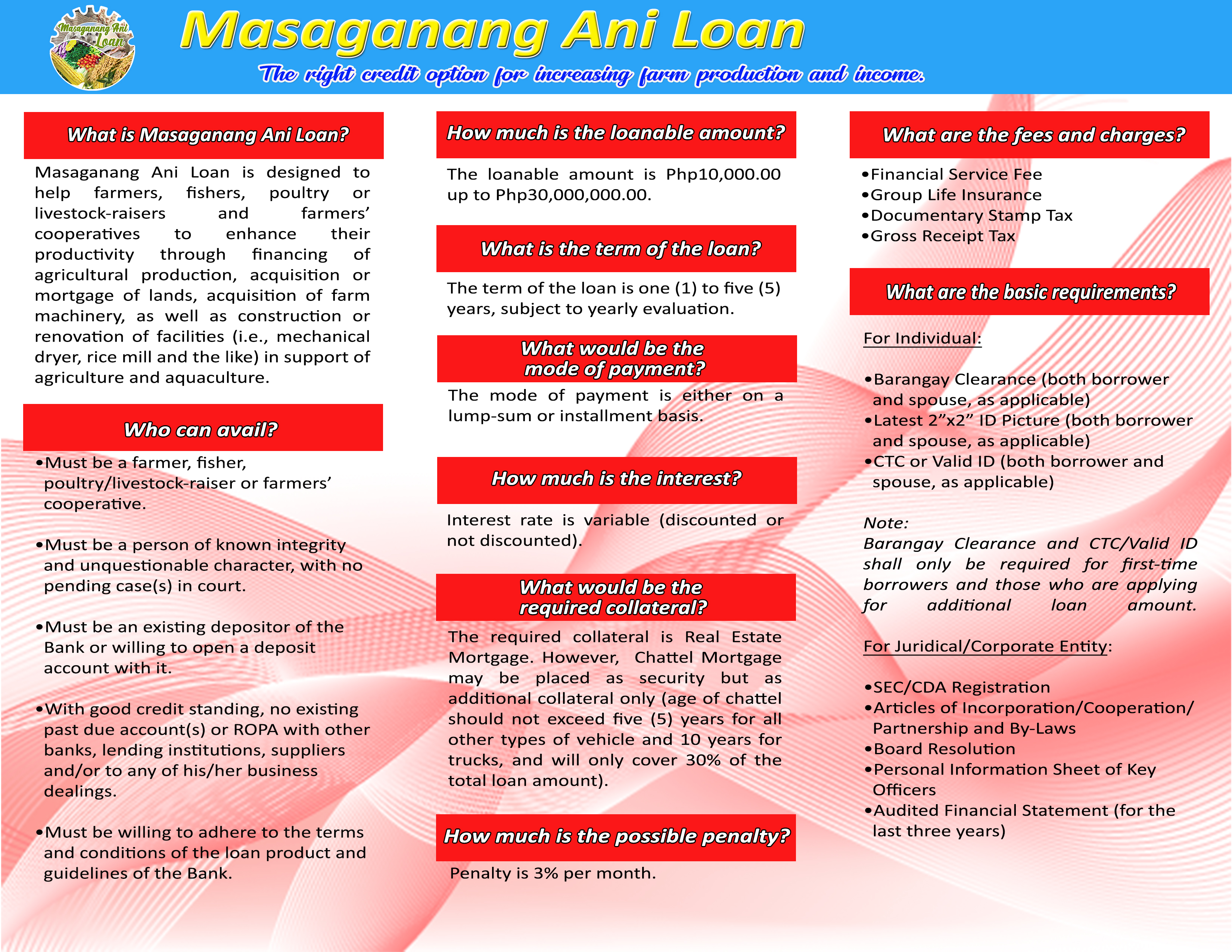 Enhance your agricultural productivity through FICOBank’s Agricultural Loan. This loan product is designed for farmers, fishers, livestock-raisers and farmers’ cooperatives. It is intended to augment productivity through the financing of agricultural production, acquisition/mortgage of land, acquisition of farm machinery and construction/renovation of facilities in support of agriculture and aquaculture. This loan product has the following salient features: