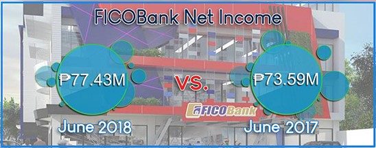 Despite the country’s rising inflation rate and waning economic growth for the second quarter of the year, FICOBank remains profitable in its business operations. It ably registered a 5.22-percent growth in net income for the first six months of 2018. With a net income of Php77.43 million, in comparison to the Php73.59-million bottom line for the same period last year, the Bank enjoys an increment of Php3.84 million, or 5.22 percent. And, in reference to the Php74.56-million target in net income for the first semester, the Bank has a 104-percent performance rating. The said growth in net income can be attributed to the strategies of the Bank in the management of its assets and liabilities, as well as its revenues and expenses. The same allowed the Bank to handle pricing, control costs and manage profitability. The increase in sales of its financial products, which is coupled with a substantial growth in low-cost deposits and high-earning loans, has likewise significantly contributed to the said net income. Barring any unforeseen events, and expressing optimism that its bottom-line trend will continue for the rest of the year, the Bank expects a net income of at least Php138.0 million at end of the year.